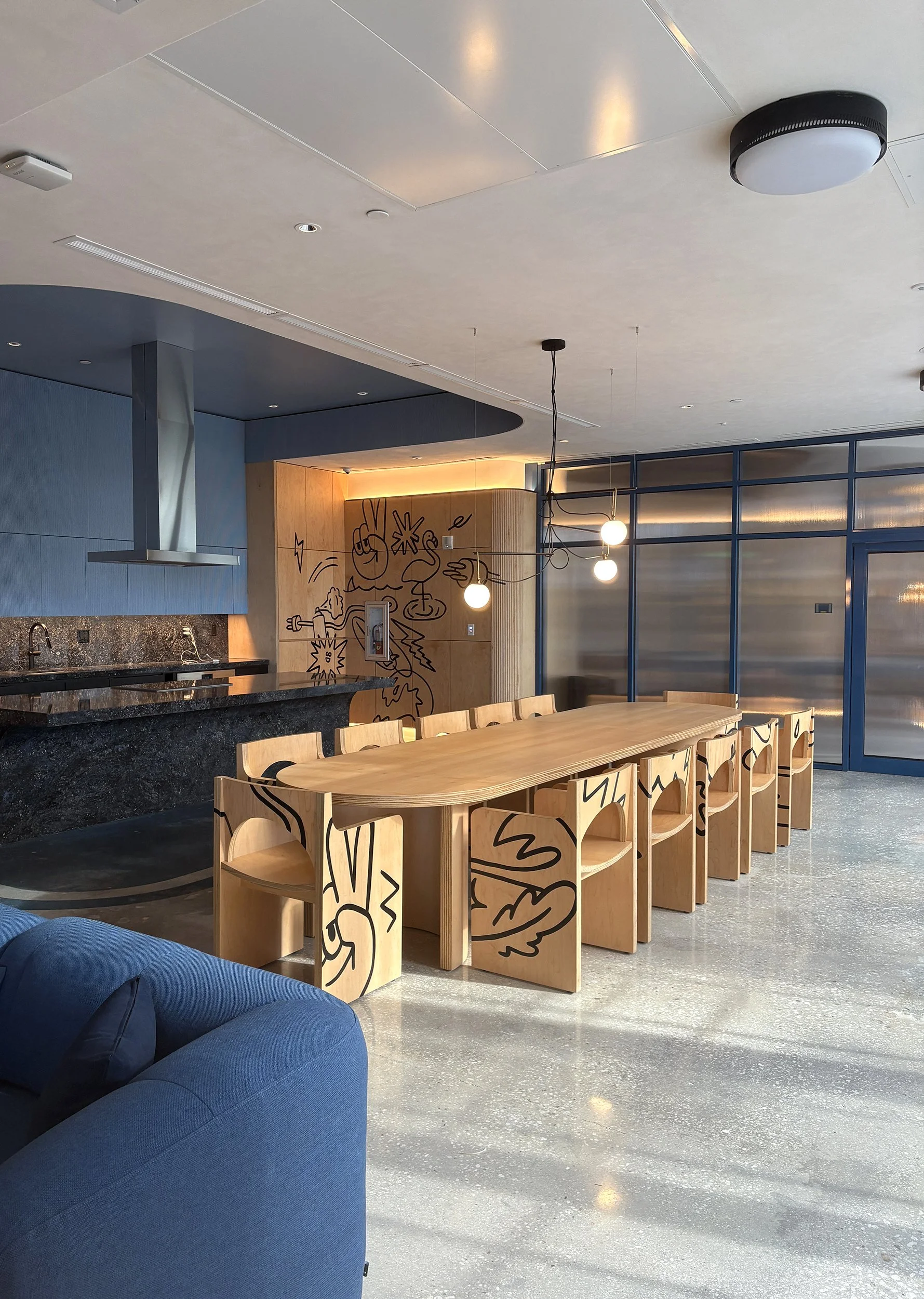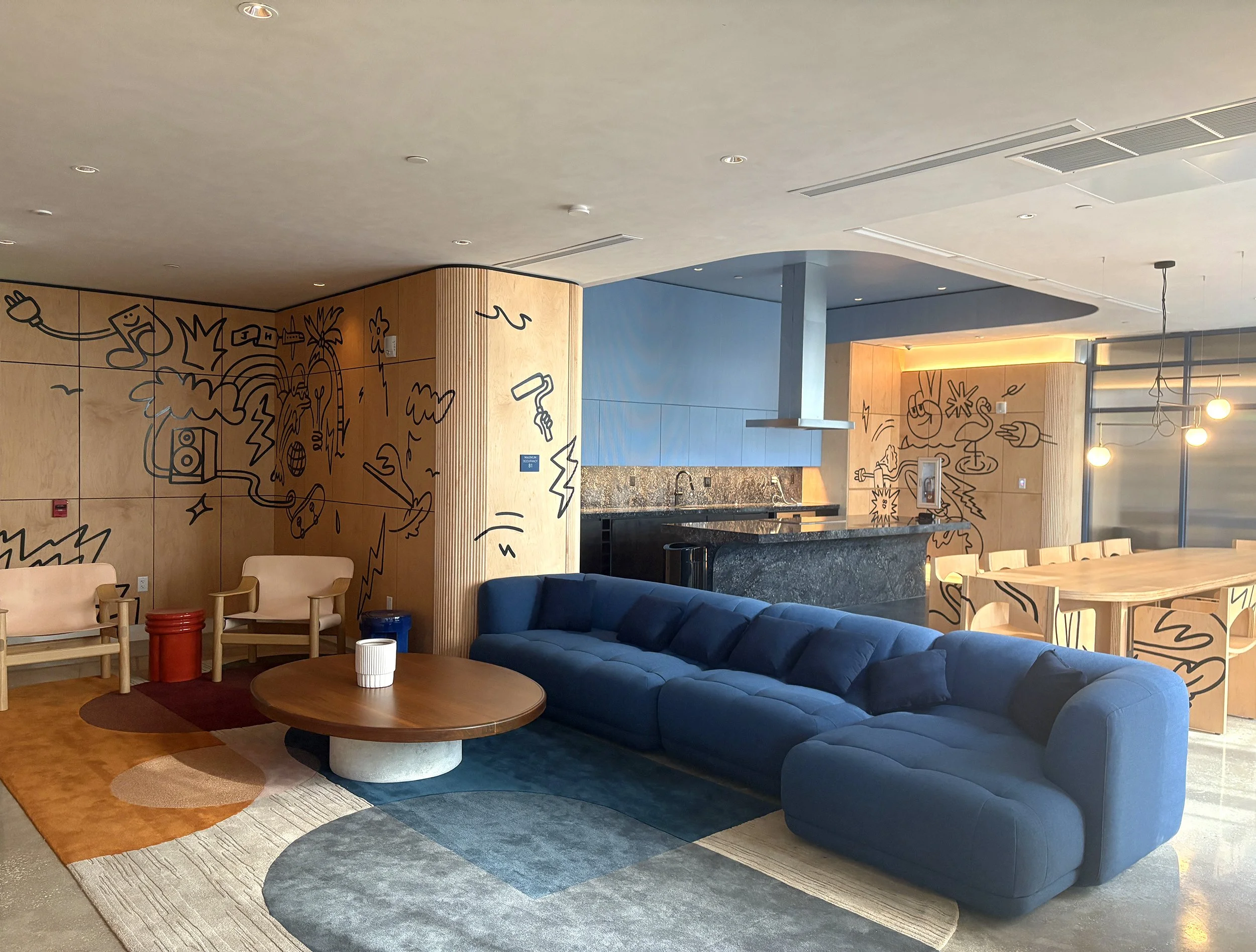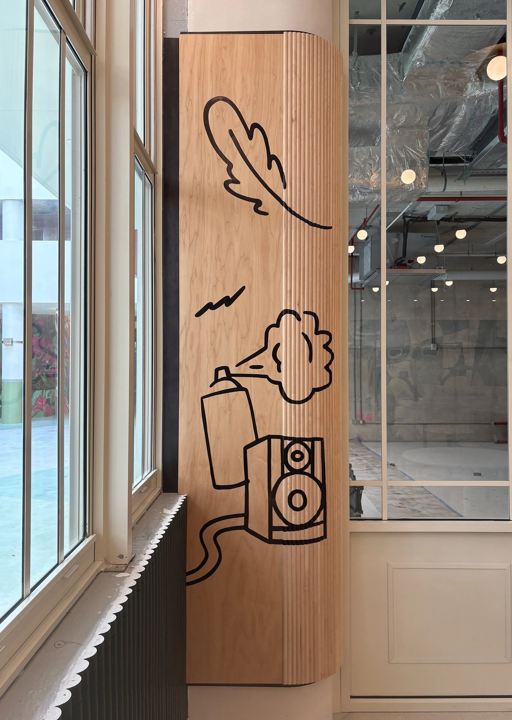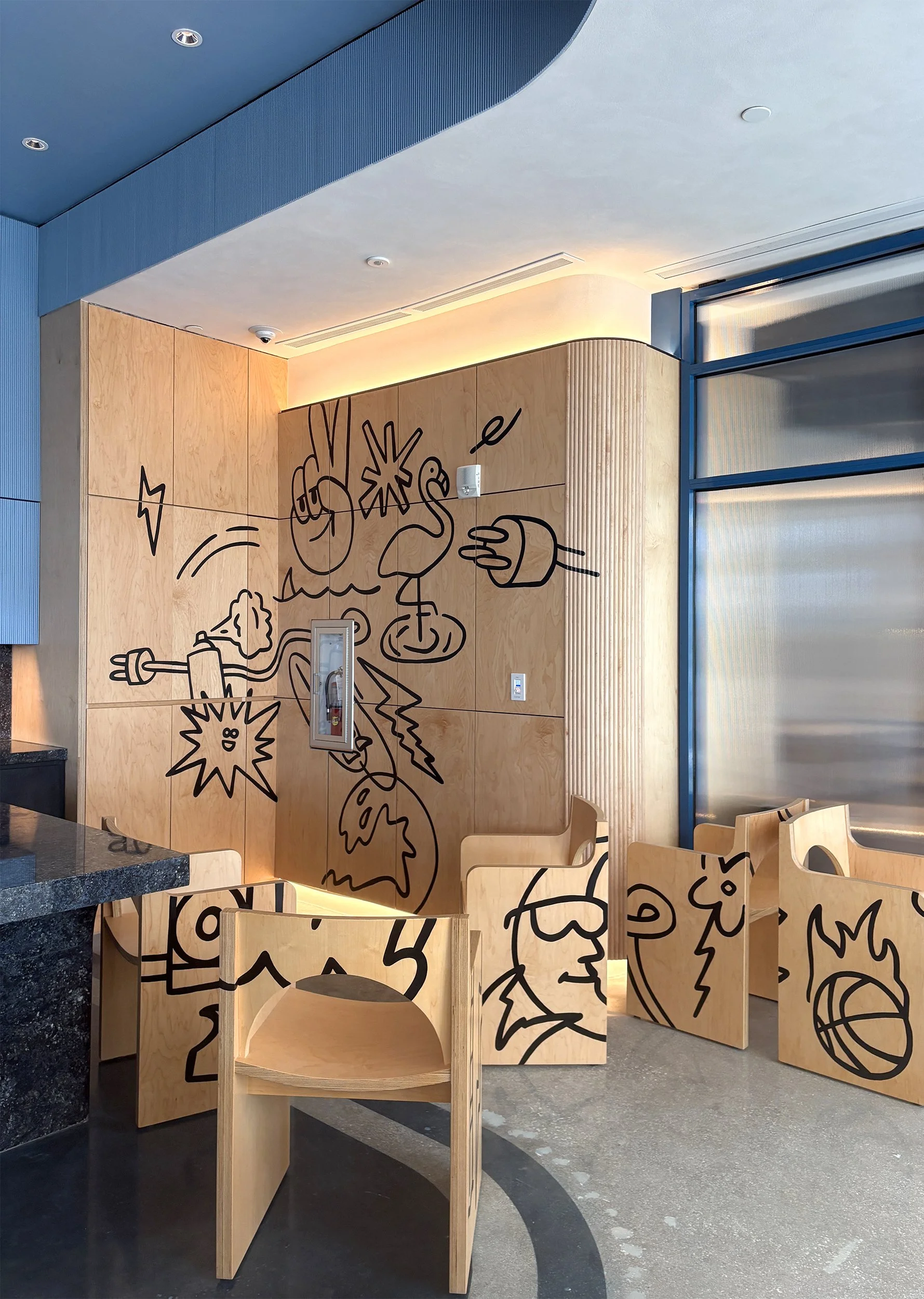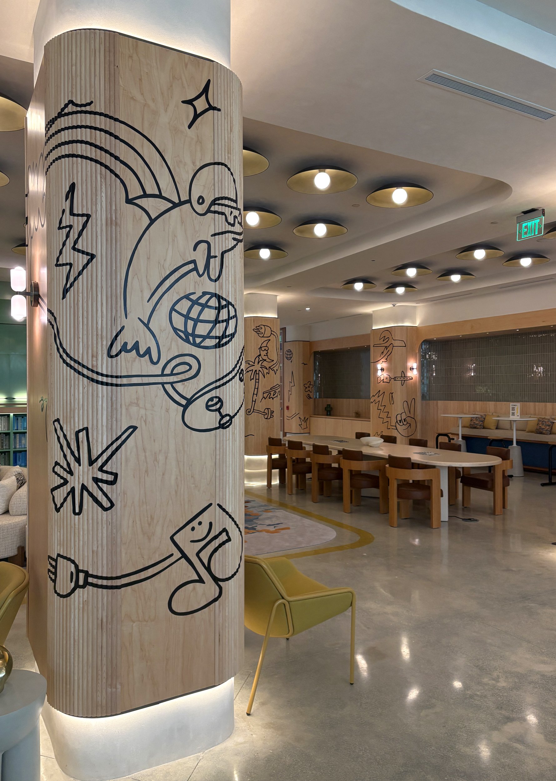 Hand-painted millwork illustrations across multiple floors at Joule House in Wynwood, Miami.